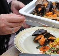 Vi sluttede af med et fælles måltid tilberedt af de mest fantastiske muslinger fra Havhaven. Størrelse og smag var helt i top, og Frans, Mahmoud og Jakob fra SMAG/Det grænseløse Køkken havde lavet meget lækre salater og friskbagt brød. Vi giver fem stjerner – lokalet blev lidt for køligt, som aftenen skred frem og trækker en stjerne ned – selve måltidet får seks stjerner af seks mulige.